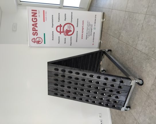 Carrello porta pupitre a 4 ruote sterzanti e frenate, puo’ portare pupitre aperte complete di bottiglie 120 posti.