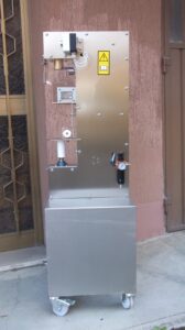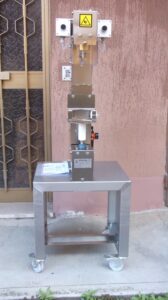 Semi-automatic caging machine for cork or plastic mushroom caps. Pneumatically driven wheeled machine.