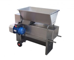 La tramoggia della pigiadiraspatrice che misura 85 x 48 cm, monta di serie una coclea di alimentazione che funziona con l’alimentazione da 220V. Alla sua base sono posizionati i rulli e l’albero diraspatore dotato di cuscinetti a sfera a tenuta stagna.